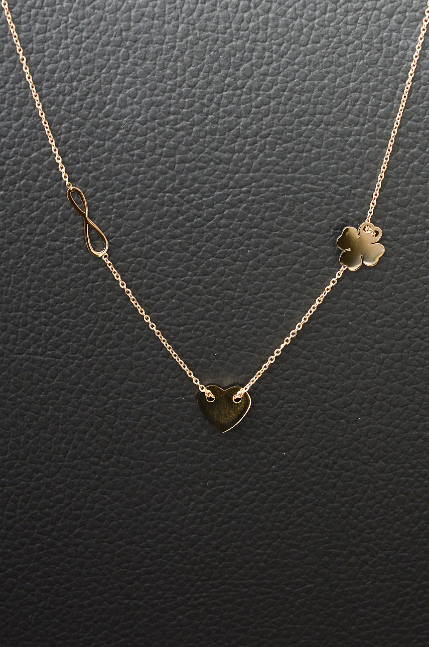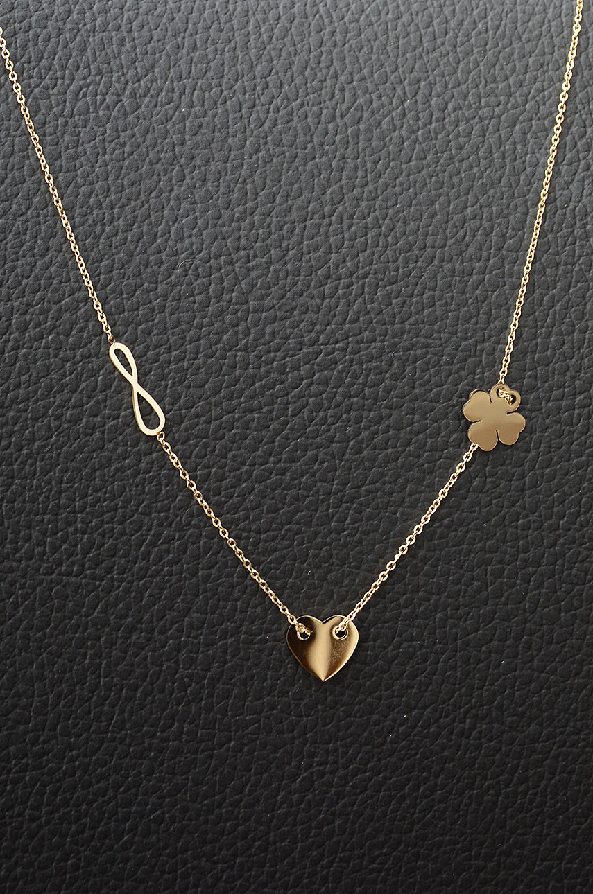 Piękny, subtelny, podkreślający kobiecą delikatność, naszyjnik celebrytka. Zawieszka: znak nieskończoności, koniczynka i serduszko. Obwód regulowany - 42 cm z możliwością wydłużenia o 3,5 cm. Cały naszyjnik jest wykonany ze stali szlachetnej próby 316.