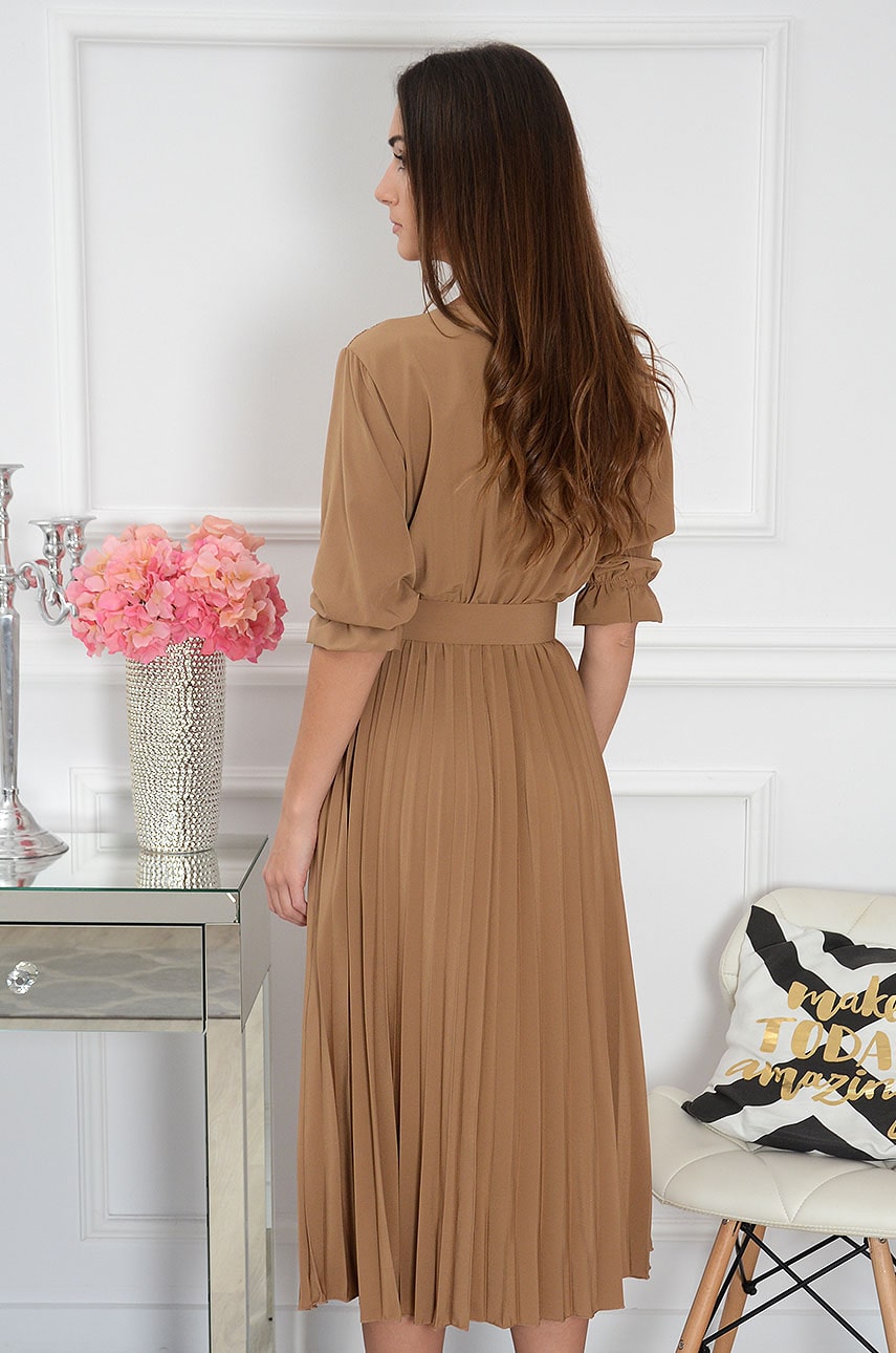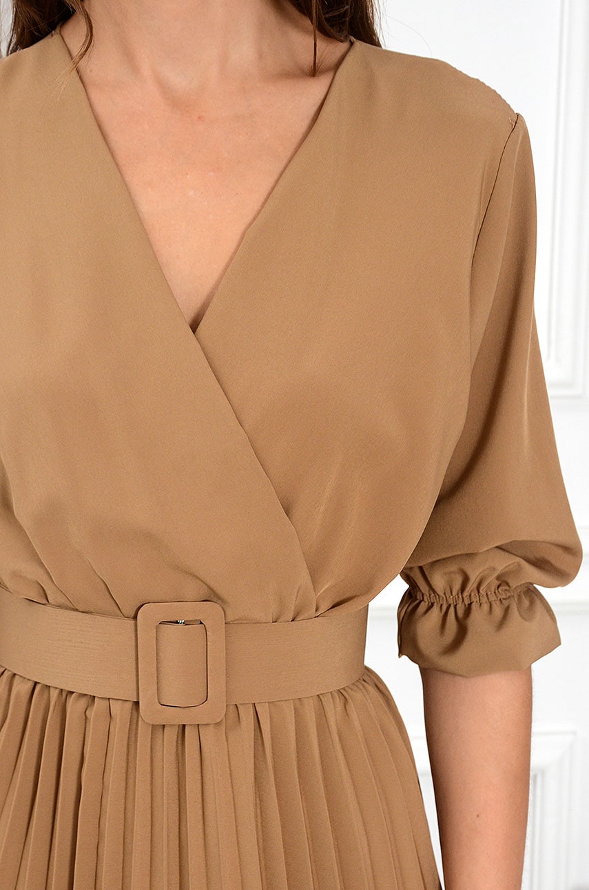 Sukienka midi plisowana z paskiem kamel. Elegancka sukienka plisowana z rękawami o długości 3/4 zakończonymi delikatną falbanką. Model z kopertowym dekoltem, który optycznie wysmukla górne partie ciała oraz szyję, a lekko rozszerzony plisowany dół ukryje szerokie biodra. Model z elastyczną gumką i paskiem w talii.