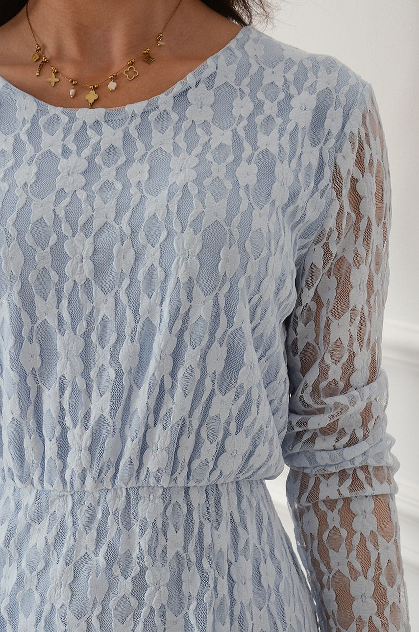 Sukienka midi z koronki baby blue. Kobieca sukienka uszyta z lekkiej koronki z okrągłym dekoltem. W pasie delikatne przeszycie, które podkreśla talię. Dolna część prosta, z rozcięciem, które eksponuje nogi. Model z długim rękawem, który zakryje ramiona i doda elegancji. Sukienka posiada krótką, dzianinową podszewkę (poza rękawami).